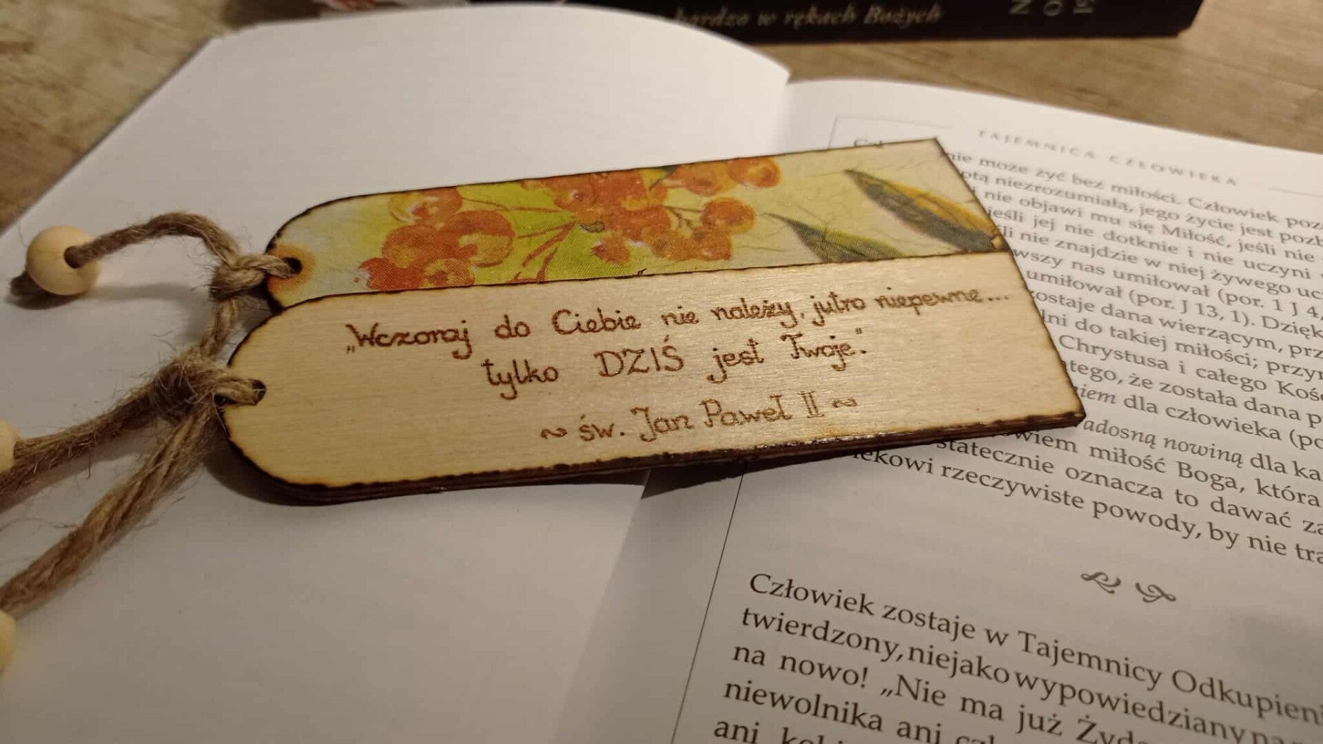 Odkryj wyjątkowe zakładki, będące połączeniem duchowej głębi i naturalnego piękna. Wykonane ze sklejki o wymiarach 3 × 12 cm, każda z nich jest starannie ozdobiona jutowym sznureczkiem z koralikami o długości około 5 cm, dodającym rustykalnego uroku.